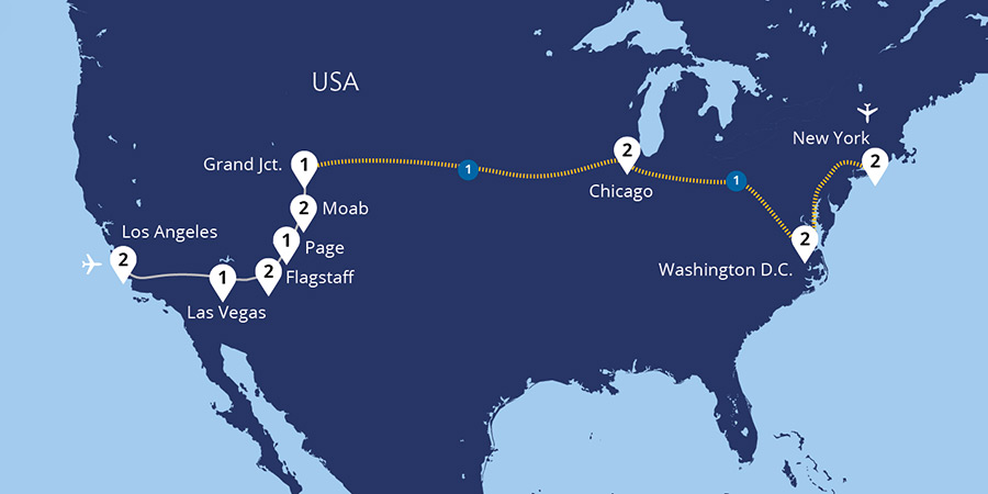 Experience a once-in-a-lifetime journey as we travel from ocean to glimmering ocean across the USA, from dazzling Times Square to the Hollywood Hills. Enjoy guided tours of America's great cities, including New York, Washington DC, Chicago and Los Angeles, with cruises around Manhattan and the Chicago River. Travel overnight from Chicago to...