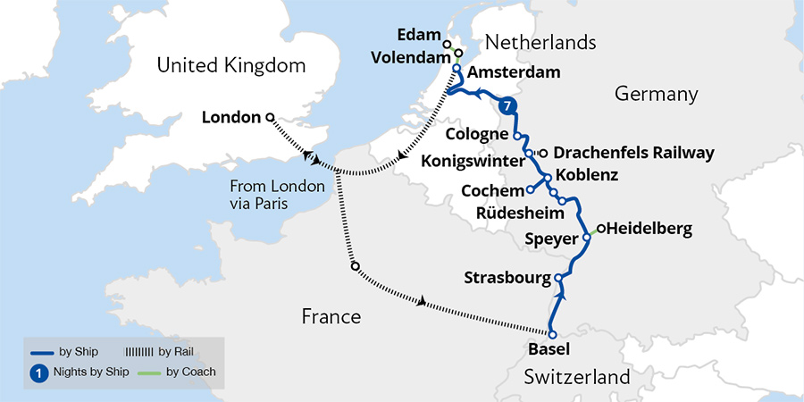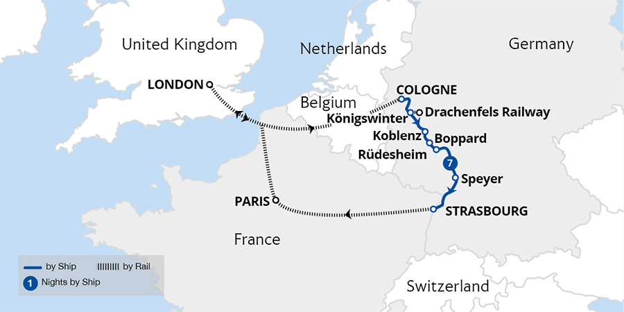 This beautifully scenic, easy-paced cruise takes us to the towns and cities of the River Rhine. Sailing by enchanting landscapes, discover Heidelberg and Strasbourg along with the sensational vistas of the UNESCO-listed Rhine Gorge. From Cologne, we sail south to explore the town of Koblenz, enjoy a guided tour of Heidelberg, and wander...