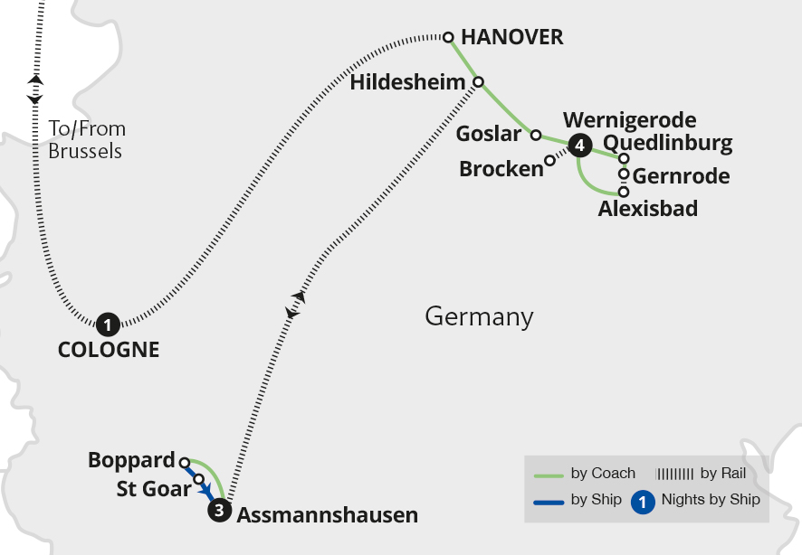 Embark on a voyage of discovery amid half-timbered towns, rolling mountains and gleaming rivers in some of Germany's most picturesque locations. Explore the medieval villages of Wernigerode, Quedlinburg and Goslar and journey to the peak of the Harz Mountains by historic narrow-gauge railway. Uncover the idyllic towns of Assmannshausen...